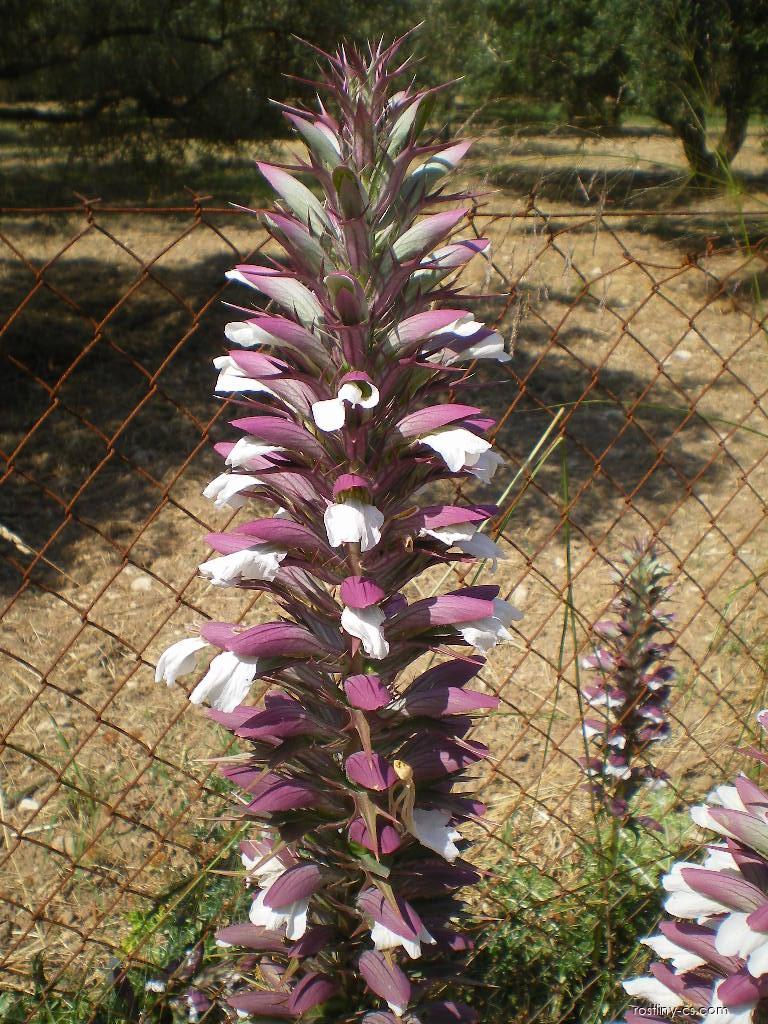 Itálie a západní oblasti Turecka. Jedná se o velice variabilní bohatě trsnatou rostlinu s z čeledi Acanthaceae s obloukovitě skloněnými, podlouhle vejčitými, peřenodílnými tmavozelenými listy. Od konce jara se objevují čistě bílé květy, které jsou podepřeny purpurovými listeny až v 100 cm vysokých hroznech.
