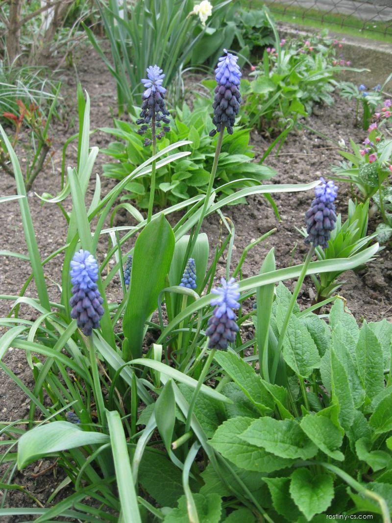 Muscari latifolium má květy modrofialové podlouhle baňkovité.