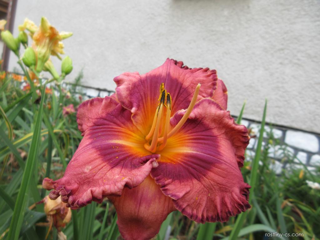 (burgundsky vínové až 17 cm velké květy mají purpurový prstenec, malé zelené hrdlo a jasně žlutý střed. Zřasené petály mají purpurové lemování se zlatou pikotáží.)Výška: 75 cm